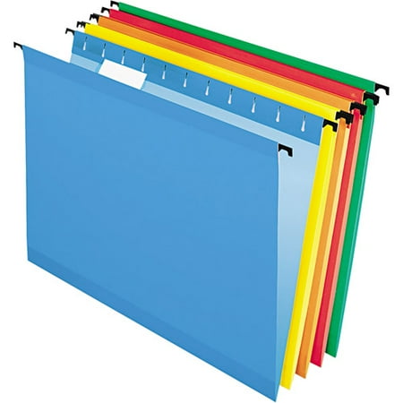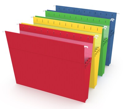 1 Set (91961), Smead Colored Hanging File Folder with Tab, 1/5-Cut Adjustable Tab, Letter Size, Navy, 25 per Box (64057), Blue Summit Supplies Letter Size Hanging File Bars, 2 Pack, Sturdy Steel Metal File Cabinet Bars for Hanging Files on Desktop or in File Drawers, Set of 2, Pendaflex 55708 Poly Hanging File Folders, 1/5 Tab, Letter, Assorted Colors (Box of 25), Hanging File Organizer. Look for reinforced hanging folders that expand 2-inches or more and make sure large files remain together in one location.